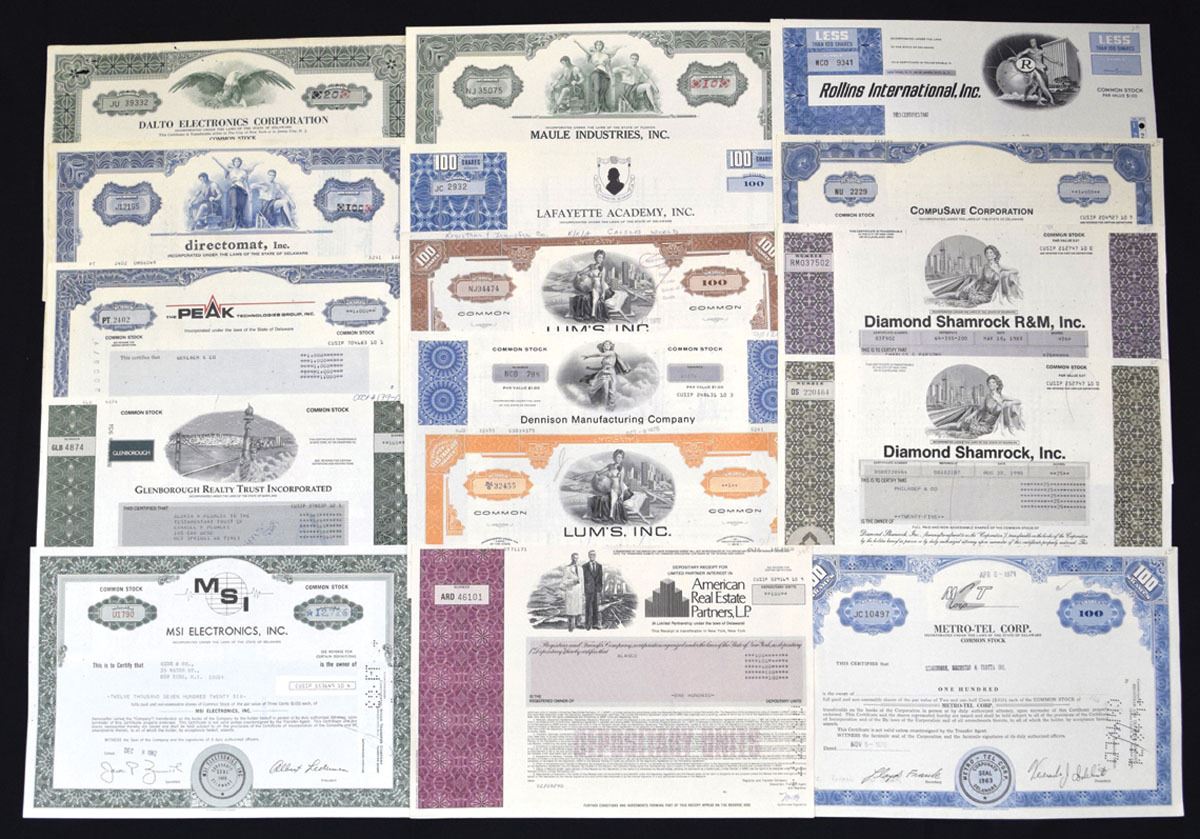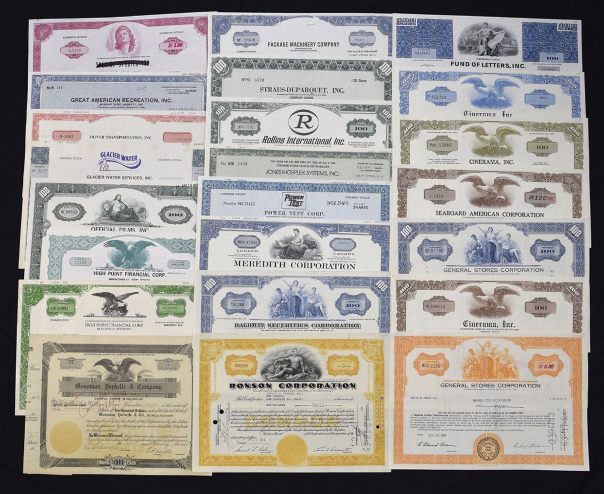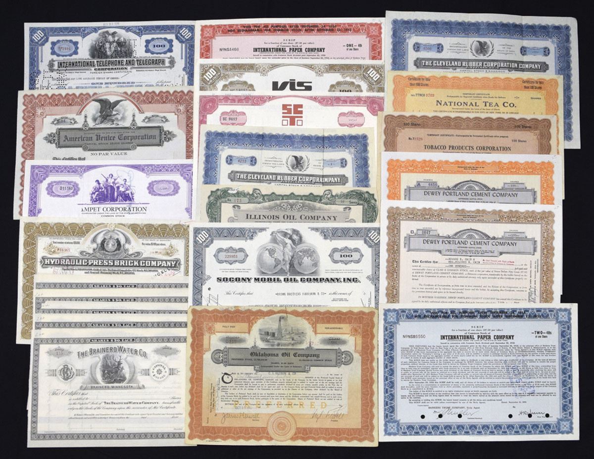 Various States, ca. 1850s-1900s. Lot of 60+ Issued, Unissued, Cancelled, and Remainder Stock Certificates representing American companies across diverse sectors including oil, utilities, chemicals, consumer goods, electronics, transportation, manufacturing, and finance, Includes: International Telephone & Telegraph Corp., International Paper Co., Socony Mobil Oil Co., Illinois Oil Co., Oklahoma Oil Co., Hydraulic Press Brick Co., The Brainerd Water Co., Columbus & Southern Ohio Electric Co., Pan American Sulphur Co., Rockwell Manufacturing Co., Seatrain Lines Inc., PPG Industries, Inc., Thermobios Pharmaceuticals Inc., Admiral Corp., Data Image Inc., ASI Communications Inc., Zenith Laboratories, Inc., Computer Horizons Corp., Marsh & McLennan Companies Inc., General Stores Corp., Cinerama Inc., Ronson Corp., Dennison Manufacturing Co., Lum’s Inc., Metro-Tel Corp., and many others. Certificates feature a range of ornate engraved vignettes including allegorical figures, eagles, industrial scenes, and corporate logos, with a spectrum of border colors. Condition varies from Fine to AU, with multiple bright, well-preserved examples. An impressive grouping that showcases a cross-section of American industry and corporate history from the early to late 20th century. (60+). Sold "AS IS" no returns accepted.
