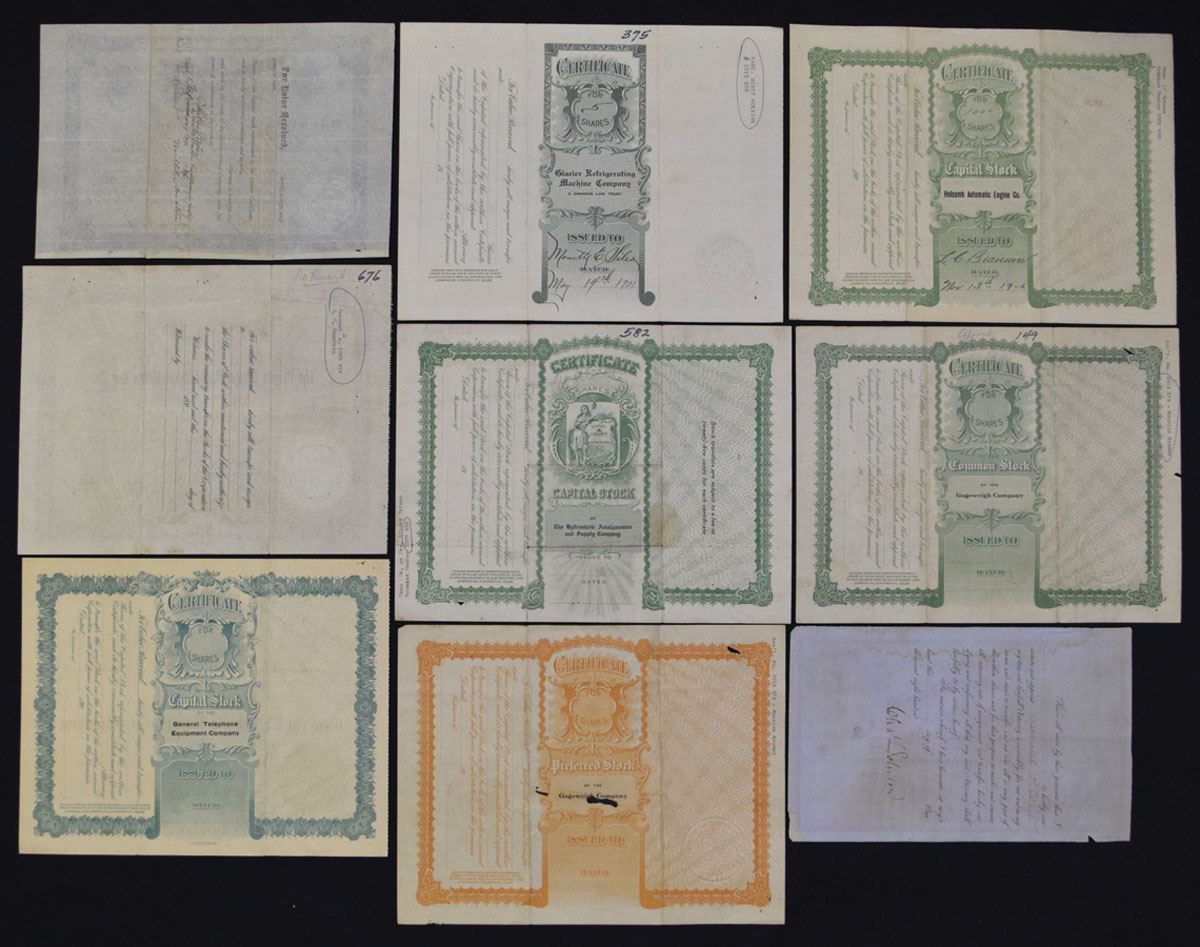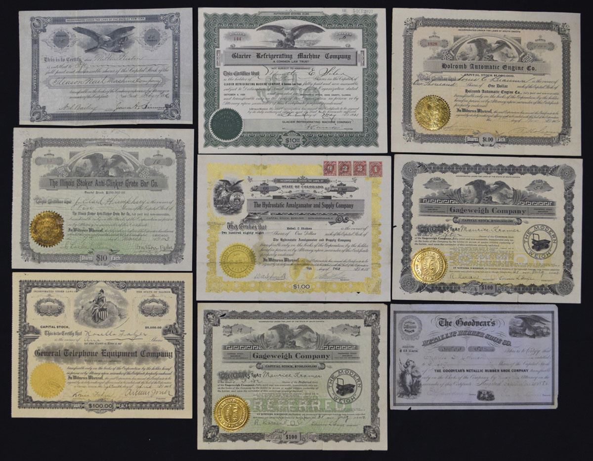 Various States....., 1886-1921. Lot of 9 Issued Certificates representing industrial, machinery, equipment and communications companies, Includes: 1886, NY. Gleason Nail Machine Co.; 1886, NY. Goodyear Metallic Rubber Shoe Co.; 1893, IL. Illinois Stoker Anti-Clinker Grate Bar Co.; 1906, SD. Holcomb Automatic Engine Co.; 1908. IL. General Telephone Equipment Co.; 1915, CO. Hydrostatic Amalgamator and Supply Co.; 1917, SD, Gageweigh Co. (2);, and, 1921, IL. Glacier Refrigerating Machine Co. Certificates range from Fine to VF condition. (9). Sold "AS IS" no returns accepted.