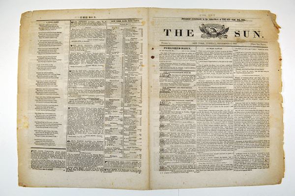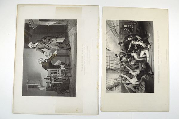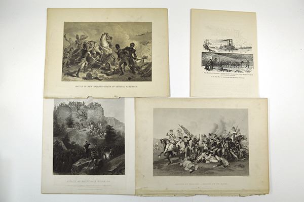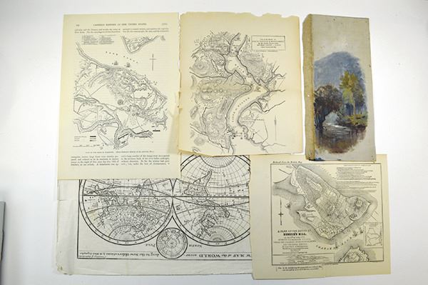 Netherlands. Ink of trees and shoreline, signed by with Jac. Smees. Amsterdam, 1765-1883; Small page of studies of men in costume and animals. F. R. Strobridge; ink of house, Woodter street near Curtis and Bleeker, 1818, NYC. Oil of stream in woods fragment; Ink of schoolchild, Hutchins, 1893, Intaglio prints for Civil war Attack at Rocky Ridge, GA, and Revolutionary War, Treason of Arnold. Death of Captain Lawrence, Boarding of the Chesapeake. Battle of Camden and death of DeKalb. Other woodcuts cut from books. Colonial maps from a late 19c book, World Map by H. Moll, edge tears. Newspaper The Sun, No 1. September 3, 1833. Rough right edge. 4 pages.