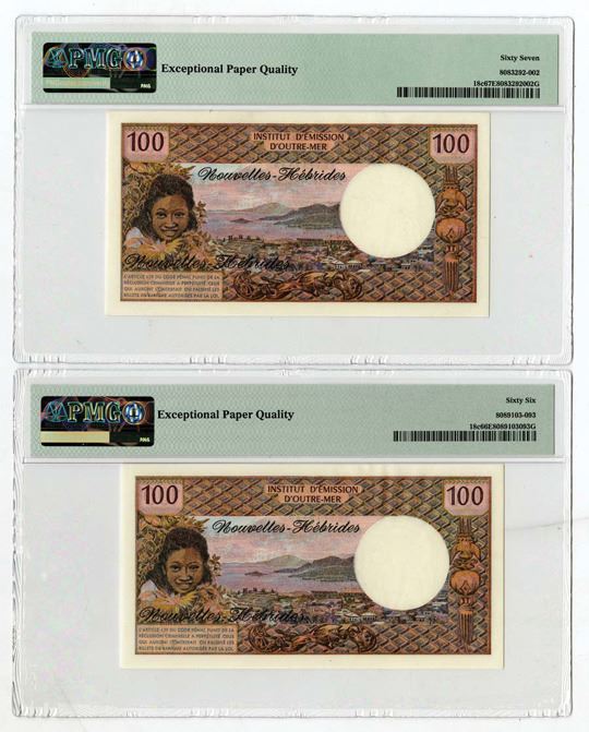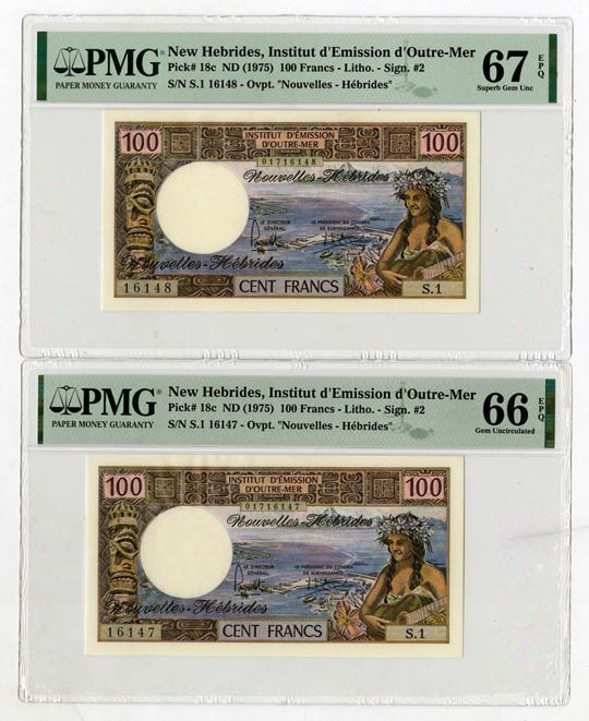 New Hebrides, ND (1975). 100 Francs, P-18c, Lot of 2 Sequential Issued Banknotes, Black on m/c underprint with woman playing guitar at right and totem poll at left, S/Ns S.1 16147 & S.1 16148, Both notes are PMG graded, First is Gem Unc 66 EPQ & other is Superb Gem Unc 67 EPQ. (2). Sold "AS IS" no returns accepted.