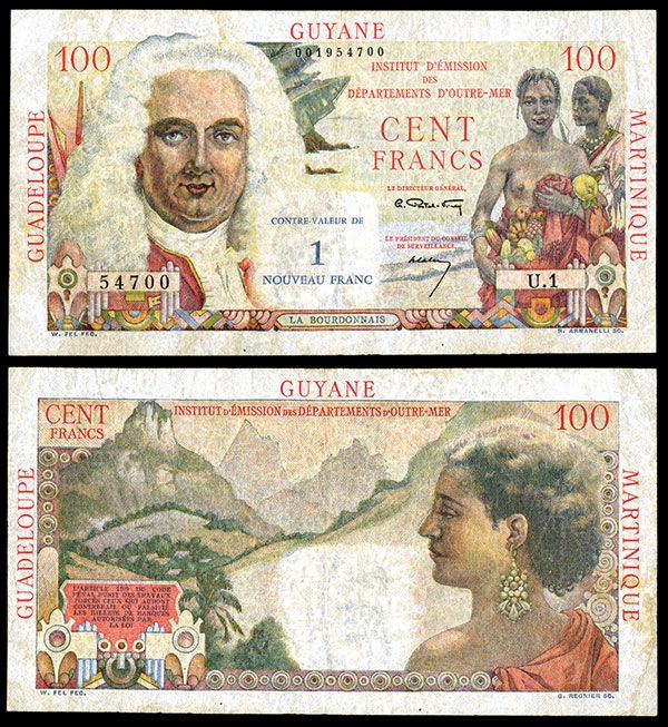 French Antilles, ND (1961), 1 Nouveau Franc on 100 Francs, P-1a, Issued banknote, Postel-Vinay / Calvet signatures, Fine to Choice Fine condition, Scarce and attractive note.