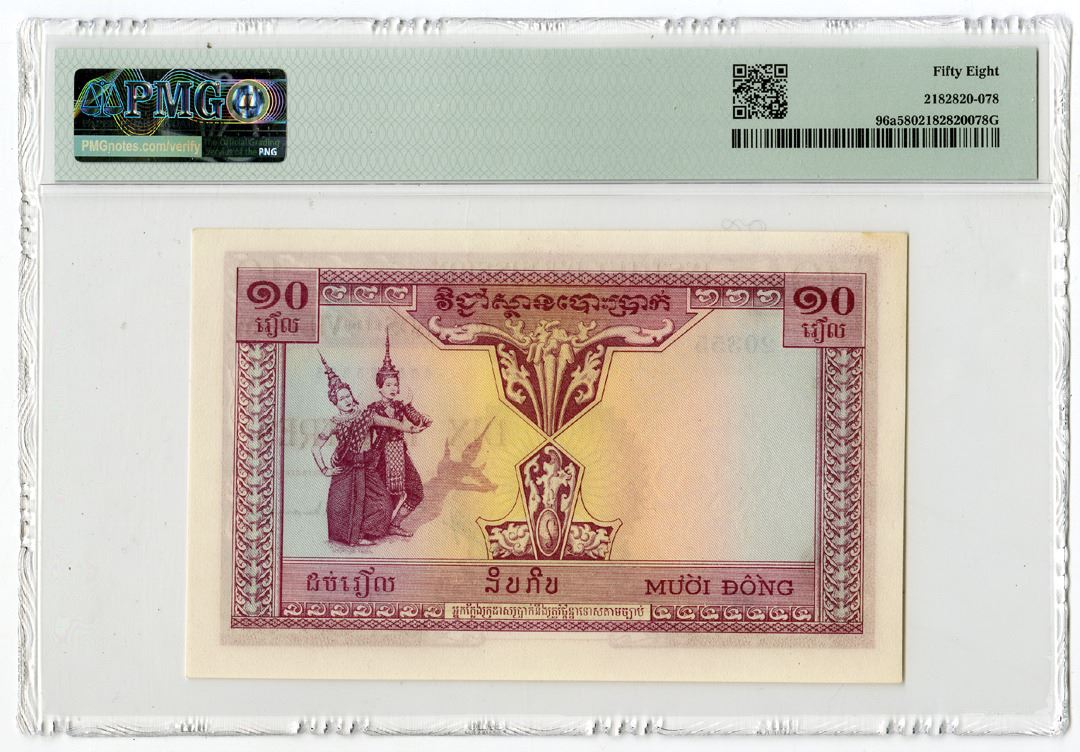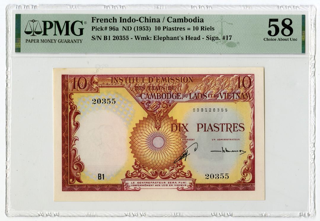 French Indo-China/Cambodia, ND (1953). 10 Piastres = 10 Riels, P-96a, Issued Banknote, Red on blue and gold underprint with stylized sunburst at center, S/N B1 20355, PMG graded Choice About Uncirculated 58.