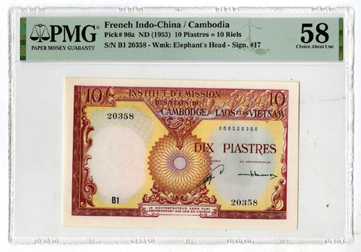French Indo-China. ND (1953). Institu d'Emission des Etats du Cambodge, du Laos et du Vietnam 10 Piastres = 10 Dong, P-96a, Issued banknote, Red on blue and gold underprint, Stylized sunburst at center, S/N B1 20358, PMG graded Choice About Unc 58.