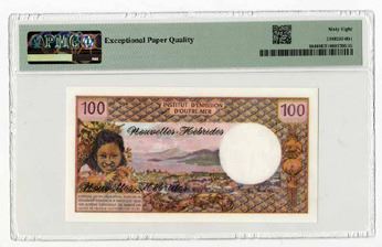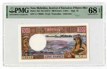 New Hebrides, ND (1977). 100 Francs, 18d, Issued Banknote, Brown on m/c printing with woman playing guitar at right and totem poll at left, Back is also brown on m/c printing, S/N V.1 70262, PMG graded Superb Gem Uncirculated 68 EPQ.