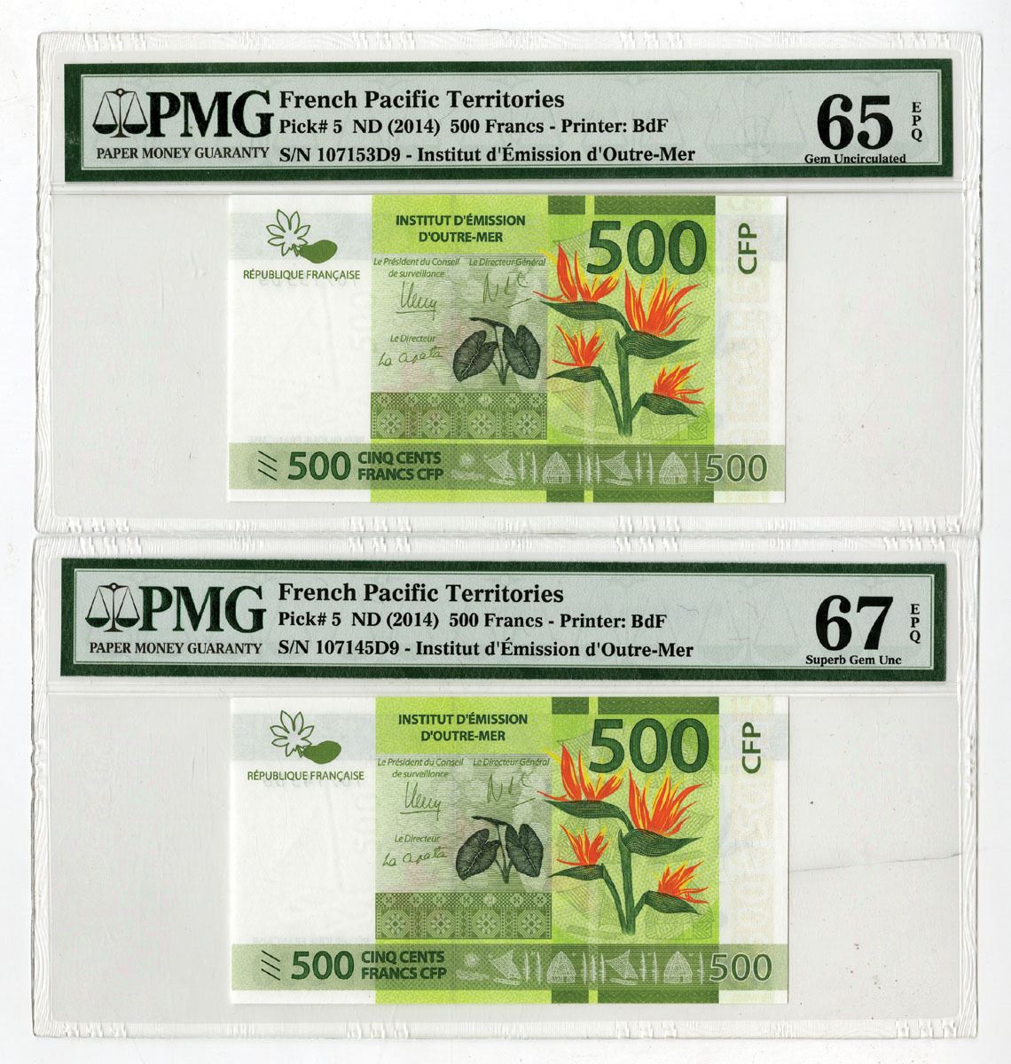 French Pacific Territories, ND (2014). 500 Francs, P-5 (2), Pair of Issued Banknotes, Greens on m/c underprint with Bird of Paradise flower at right, Back is green on m/c with more flowers, S/Ns 107145D9 & 107153D9, Both notes are PMG graded: First is Superb Gem Unc 67 EPQ and other is Gem Unc 65 EPQ. (2). Sold "AS IS" no returns accepted.