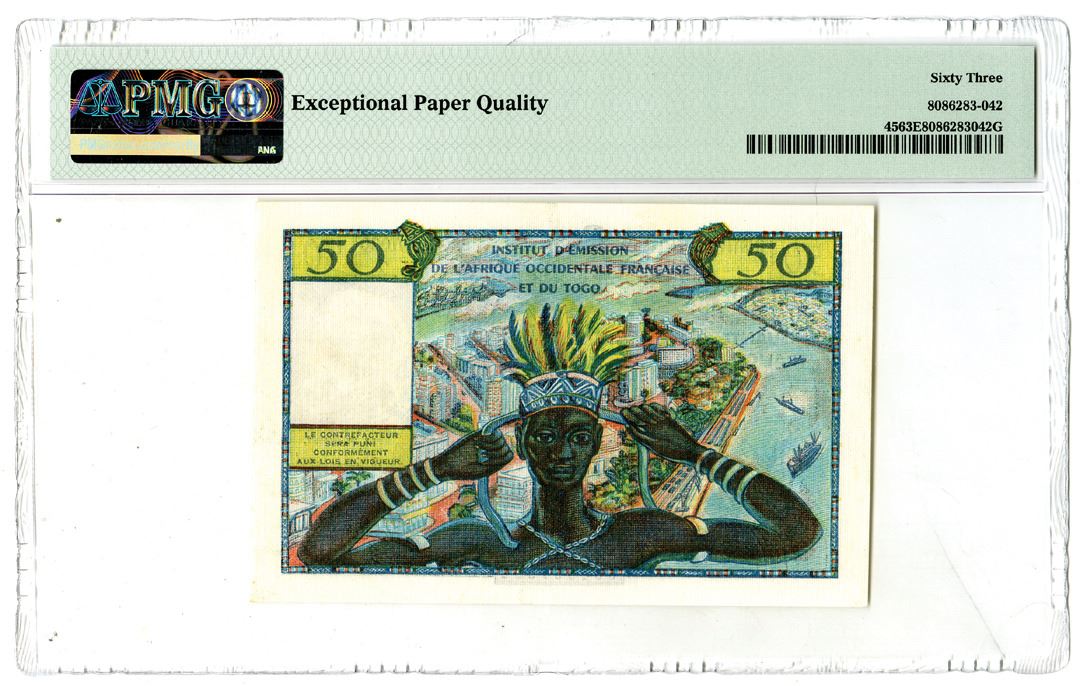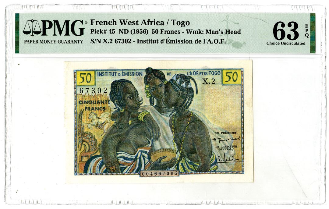 French West Africa/Togo. ND (1956). 50 Francs, P-45, Issued banknote, Black and multicolor, S/N X.2 67302, Watermark: Man's Head, PMG graded Choice Uncirculated 63 EPQ.
