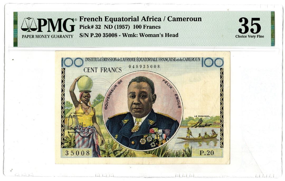 French Equatorial Africa/Cameroun. ND (1957). 100 Francs, P-32, Issued banknote, Blue and multicolor, S/N P.20 35008 - Watermark: Woman's Head, PMG graded Choice Very Fine 35.
