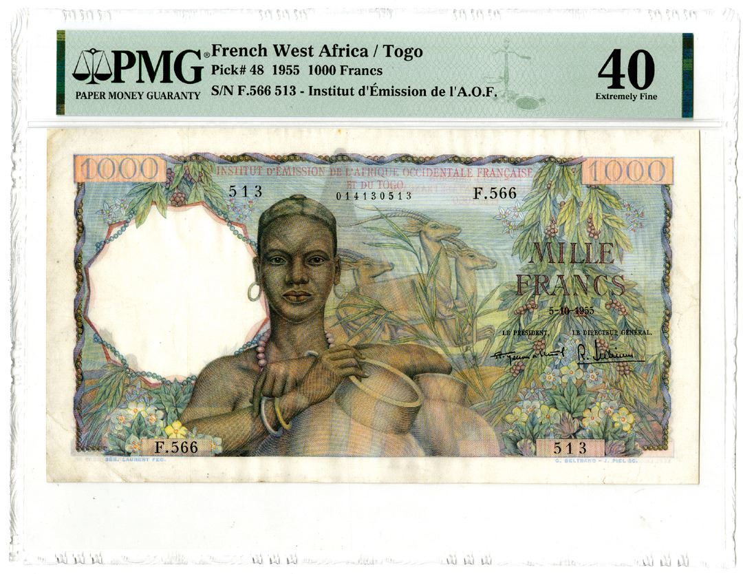 French West Africa. 1955. 1000 Francs, P-48, Issued Banknote. Red and blue on m/c underprint with native man at center. S/N F.566 513. PMG graded Extremely Fine 40.