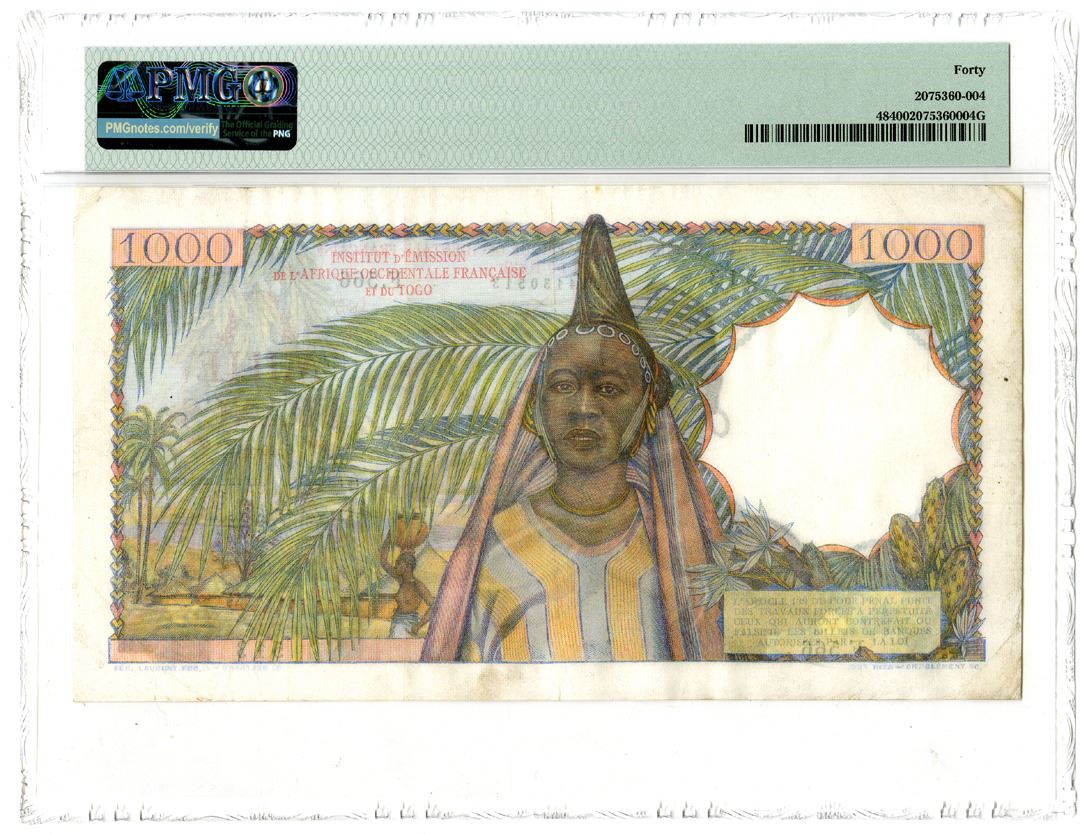 French West Africa. 1955. 1000 Francs, P-48, Issued Banknote. Red and blue on m/c underprint with native man at center. S/N F.566 513. PMG graded Extremely Fine 40.