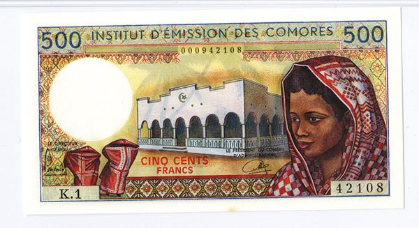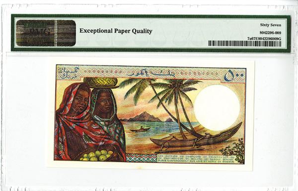 Comoros, issued 500 Francs, P-7a, PMG graded Superb Gem Uncirculated 67 EPQ.