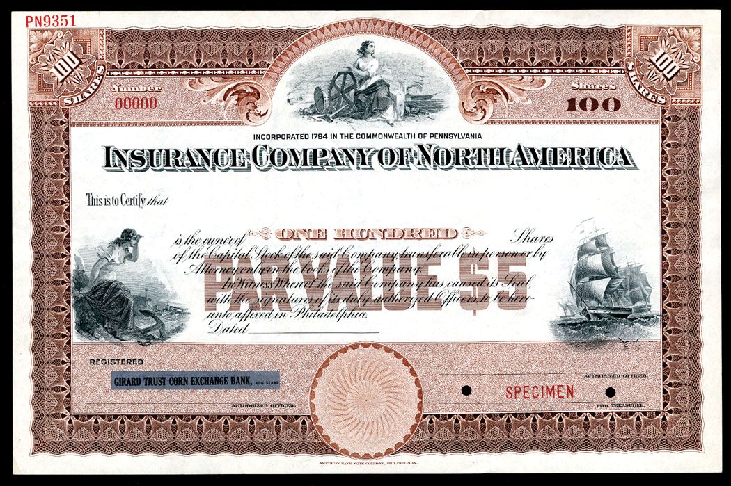 Specimen stock certificate. Brown-red border. POC's. XF condition. Scarce insurance company stock. Incorporated in 1794 in Pennsylvania.