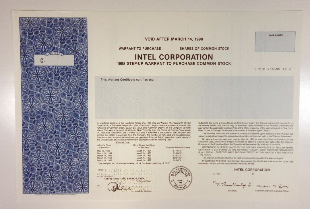 Delaware, 1990s. 1998 Step Up Warrant to purchase Common Stock, Odd Shares, Specimen Stock Certificate, Black text with blue border and undertint. Specimen POCs, VF condition, SC-USBN. Intel Corporation is an American multinational corporation and technology company headquartered in Santa Clara, California, in Silicon Valley.