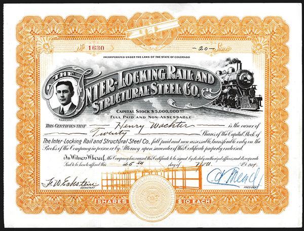 Colorado, 20 Shares, Black on orange border, Barnhill at left, locomotive at right and sample of steel structure at bottom, VF-XF.