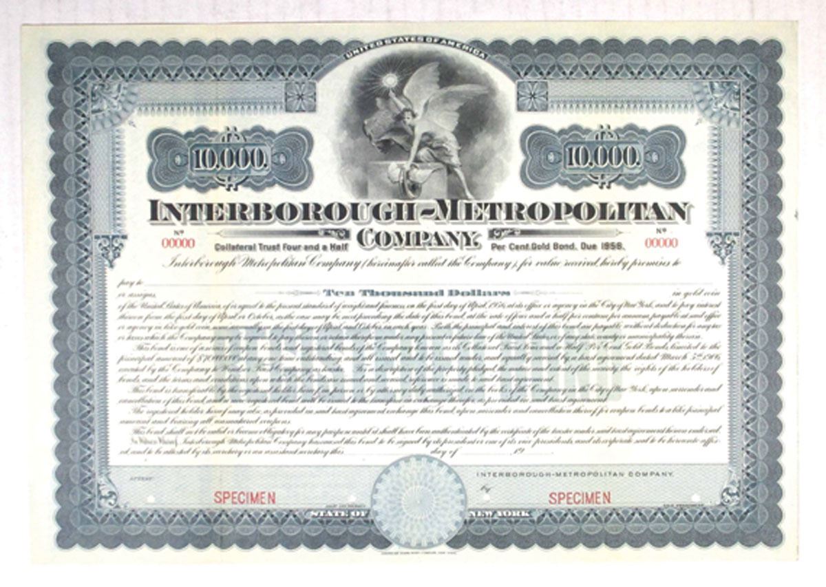 New York, 1906, $10,000, 4 1/2% Collateral Trust Gold Specimen Bond, Black on blue border and underprint, Winged allegorical figure holding light top center, POC's, red SPECIMEN overprints, and red s/n "00000", VF-XF condition, ABNC.