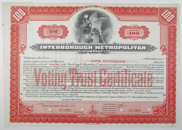 New York, ND (1930s). 100 Shares Specimen Voting Trust Stock Certificate, Black text with red border and underprint, Allegorical angel with winged gear at top center. Red specimen overprints, 00000 serial number and POCs. VF condition, ABNC. The Interborough Rapid Transit Company (IRT) was the private operator of the original underground New York City Subway line that opened in 1904, as well as earlier elevated railways and additional rapid transit lines in New York City.[2] The IRT was purchased by the city in June 1940. August Belmont and Cornelius Vanderbilt were voting trustees for this company. Rare, historic and early NY subway related company.