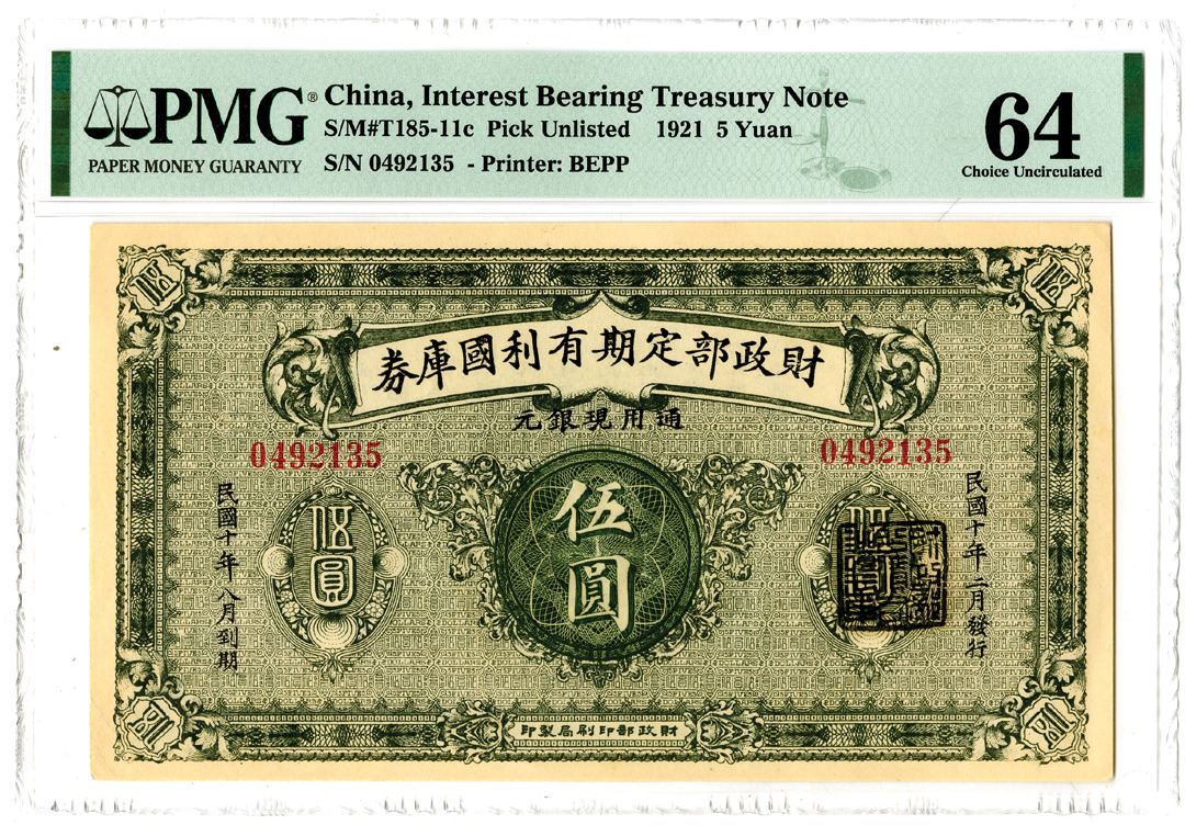 China. 1921 (Unlisted date). 5 Yuan, P-Unlisted S/M#T185-11c, Issued banknote, Dark and light green, S/N 0492135, PMG graded Choice Uncirculated 64. Printer: BEPP.