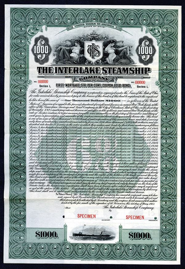 OH. $1000, 1st Mortgage 6% Gold Coupon Bond, Black on Green border and underprint, Allegorical women flanking company logo on top, steamship on bottom, Red SPECIMEN overprints and POC's, VF-XF condition, ABNC. Not offered by us previously.