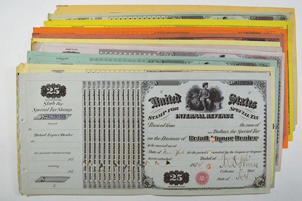 Variety of licenses and value and years. Includes: Retail Liquor Dealer, Wholesale Dealer in Malt Liquors, Peddler 4th Class, Wholesale Liquor Dealer, Dealer in manufactured tobacco. Includes examples from 1874, 1875, 1876, 1877, 1879, 1880, 1882, 1883, 1884. Many signed and locations filled in. Unissued. All POC cancelled. 16 pieces.