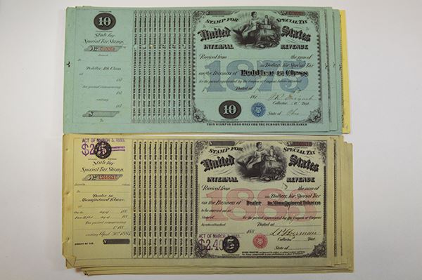 Variety of Licenses in multiples: 1875 Peddler 4th Class (4); 1877 Dealer in Manufactured Tobacco (8); 1883 Dealer in Manufactured Tobacco (11). All with POCs some signed with locations filled in. 23 pieces.