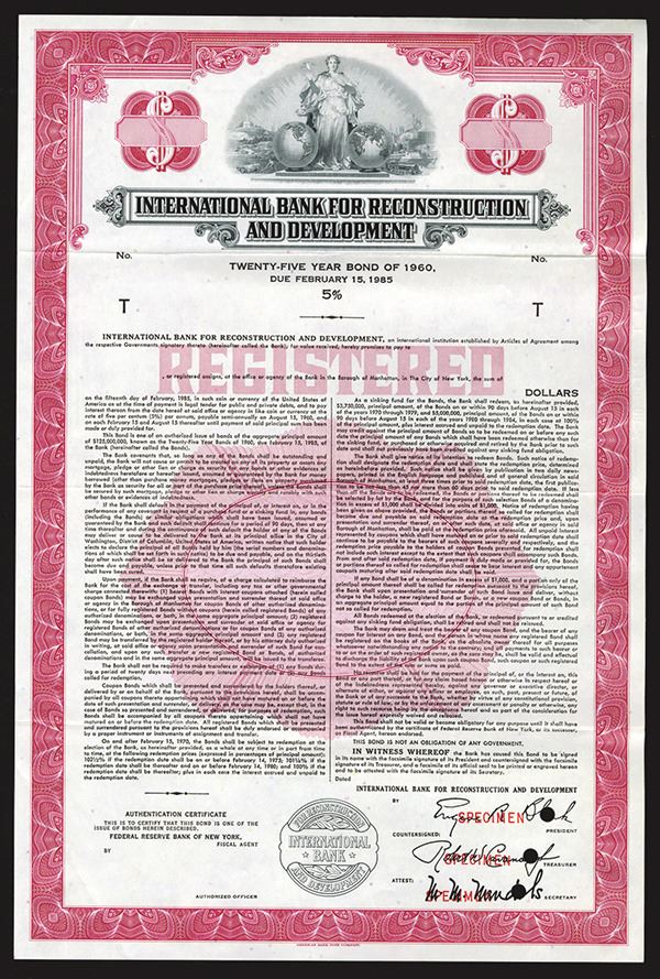 $-Odd Amount Specimen 5% Registered Bond, Black print on red/pink border and under tint, Image of allegorical female at top standing between two hemispheres of the globe, Specimen overprints and POC's, VF-XF condition, ABNC.
