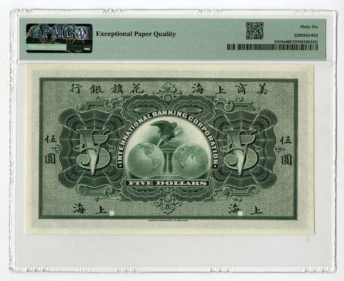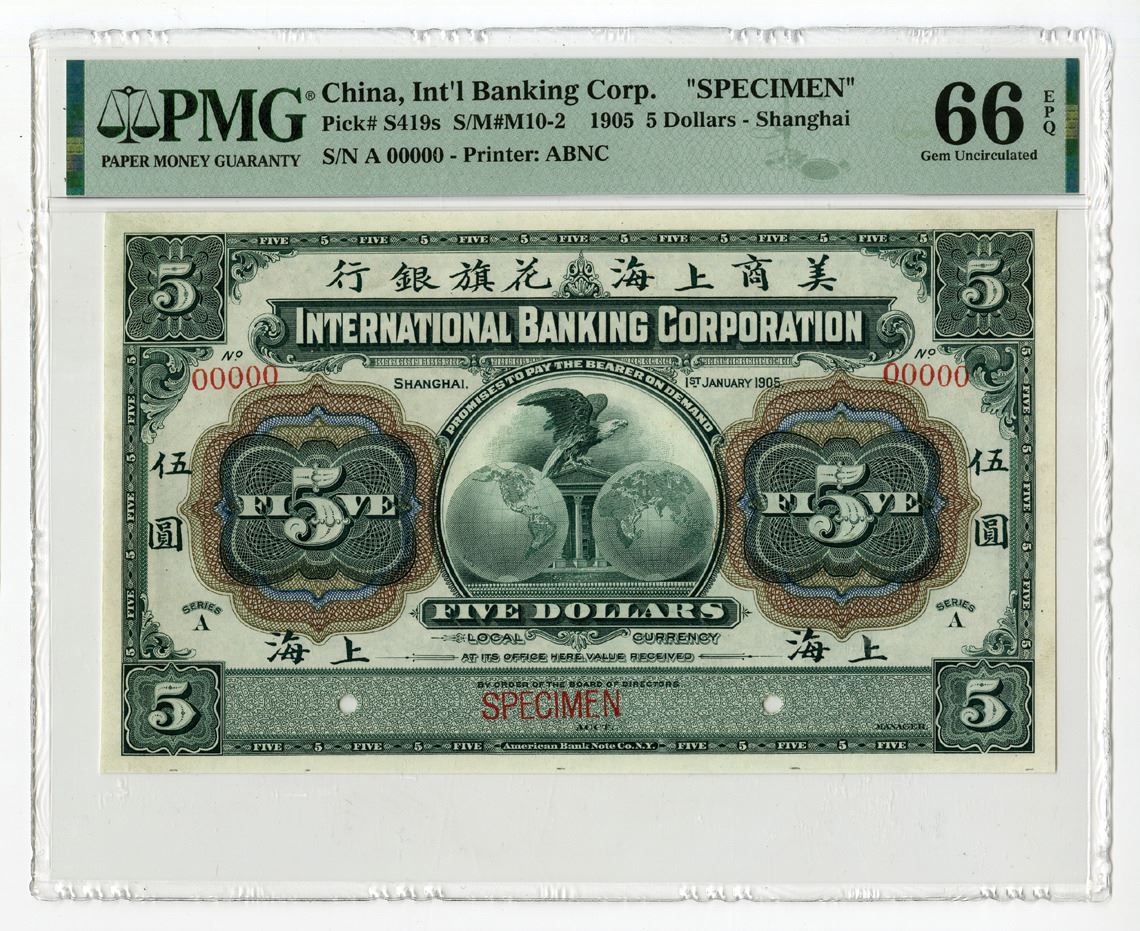 Shanghai, China, 1905. 5 Dollars, P-S419s S/M#M10-2, Specimen Banknote, Green on m/c underprint with Bald Eagle between hemispheres of the Globe at center, Back is green with same eagle vignette, S/N A 00000, Specimen overprint and POCs, PMG graded Gem Uncirculated 66 EPQ, ABNC.