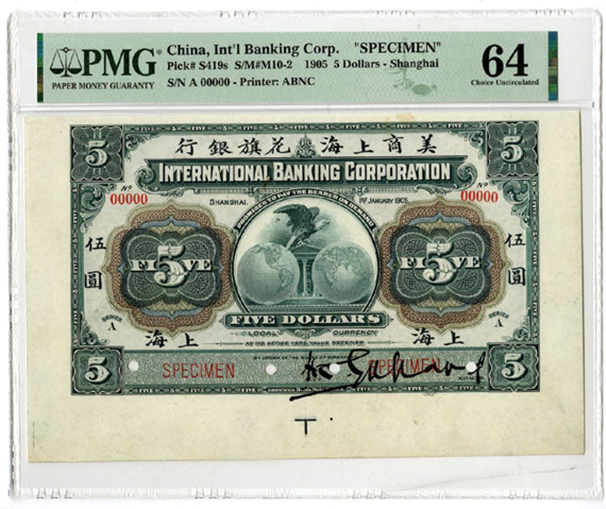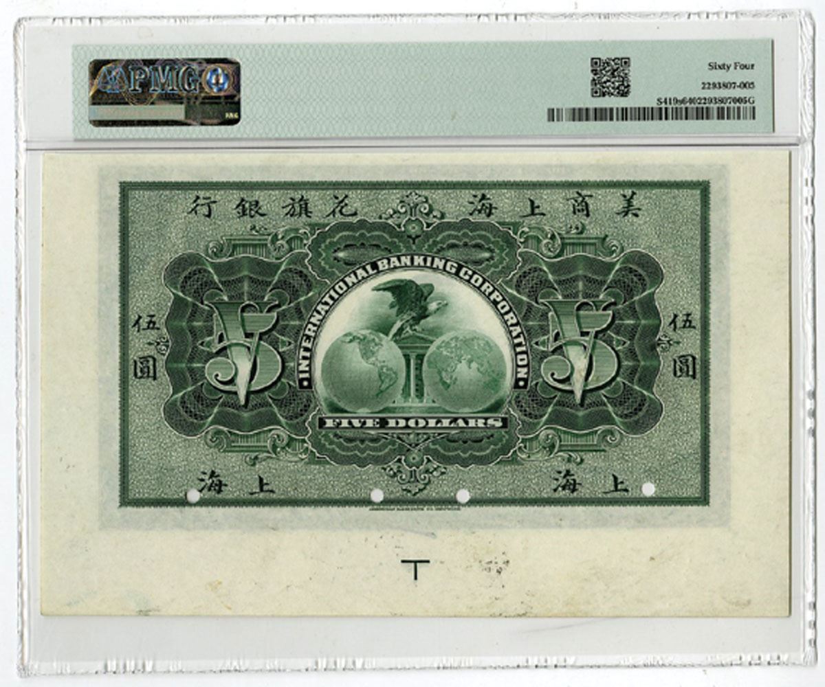 Shanghai, China, 1910. 5 Dollars, P-S413s, S/M#M10-2, Specimen Banknote, Green printing on m/c underprint, Eagle and globes in middle, Back is green with same vignette at front, S/N 000000, Specimen overprints and POC's, PMG graded Choice Uncirculated 64, ABNC.
