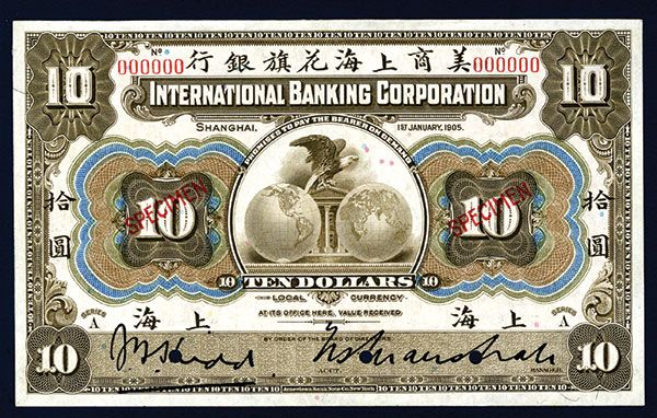 Shanghai, China, 1905. $10, P-S420s, S/M #M10-3. Brown face and orange back. 2 printed signatures. Specimen banknote. Red specimen overprint, “00000” serial numbers and POC's. Choice uncirculated condition. ABNC.