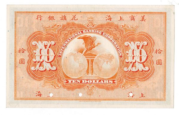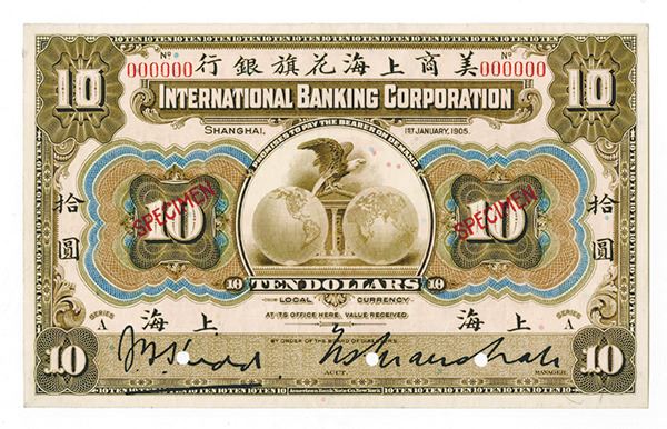 Shanghai, China, 1905. $10, Ser.A, P-S420s, S/M #M10-3. Brown face and orange back. 2 printed signatures. Specimen banknote. Red specimen overprint, Ò00000Ó serial numbers and POC's. Choice uncirculated condition. ABNC.