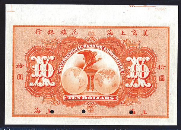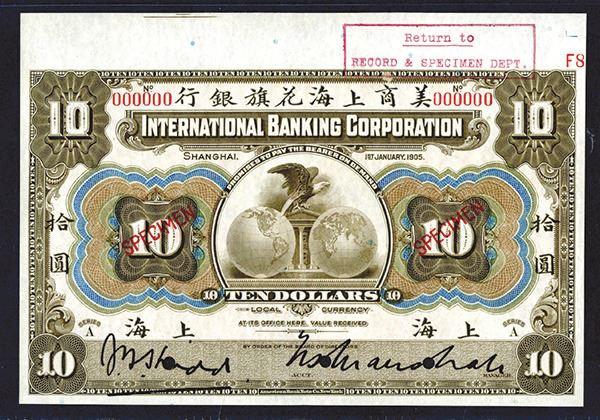 Shanghai, China, 1905, $10, P-S420s (S/M #M10-3), Specimen banknote, Brown on m/c with eagle flanked by 2 globes on face, back orange with same vignette. PMG graded "64 Choice Uncirculated. Large excess margin on top with archival overprint "Return to Record & Specimen Department". Rare and popular note that was a Shanghai, China subsidiary of National City Bank which is presently today's Citibank. ABNC.