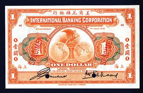 Shanghai, China, 1919. $1, P-S423s, S/M #M10-50a. Specimen banknote. Orange on m/c on face and green back. 2 printed signatures. Red specimen overprint, “00000” serial numbers and POC's. Choice uncirculated condition. ABNC.