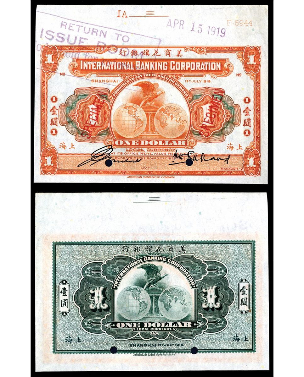 Shanghai Branch, $1, P-S423s, Specimen banknote, Orange face and green back, Red specimen overprint and POC's, no Ò00000Ó serial numbers. CU with large even margins and large excess selvedge on top with archival date "Apr 15 1919" and hand stamp. ABNC.