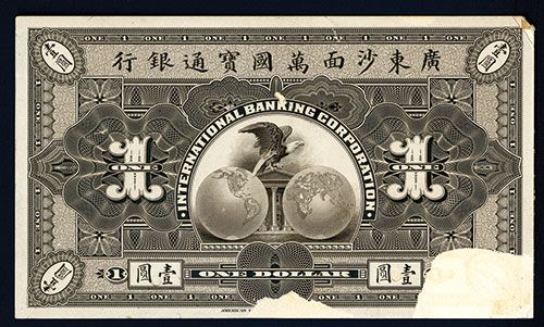 Canton. 1909. $1. P-S40. (S/M #M10-10). Unlisted back proof banknote without face. Dark brown with eagle and globe logo. Printed on india on thin card, Unfortunately, this was part of a larger collage made by ABNC possibly in the early to mid teens that was damaged and torn apart. The note is intact except the UR corner has been jammed and a small piece bent over on the tip and the LR corner and bottom have missing pieces and there is one small spot in middle with a missing spot, otherwise, the note looks VF to XF with problems. ABNC. Rare note.