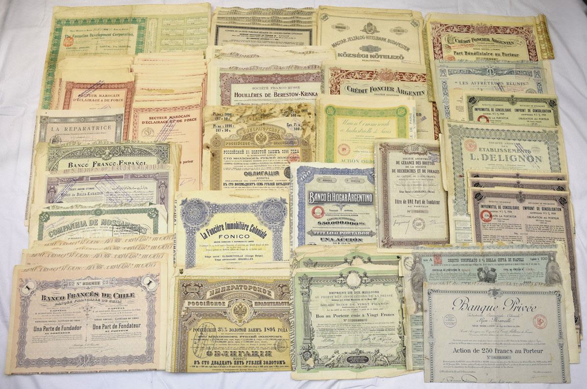 Various Countries. Lot of 74 issued and cancelled bonds and share certificates representing banks, credit Foncier institutions, mortgage banks, industrial and development companies, and government or municipal loans. Includes examples from French, Argentine, Chilean, Spanish, Russian, Belgian colonial, Italian, and Hungarian issuers, among others. Mixture of bearer bonds, founder’s shares, and mortgage-backed issues. Designs feature engraved borders, coats of arms, allegorical figures, and multilingual text. Conditions range from Fair to VF overall, with folds, toning, edge wear, stamps, and cancellations present. (74). Sold “AS IS” no returns accepted.