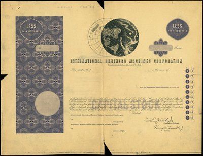 NY. 1960's. Proof. 3 different proof certificates. All with vignette of Mercury reaching toward map of the world with stars in background. All 3 are matching purple and printed on light brown paper. Unique in archive. 1). < than 100 shs. 2). 100 shs. 3). Odd shs. All were printed on oversize paper and have wedges cut from the sides for aligning the printing plate for the multiple colors used (purple and black). International Business Machines Corporation (IBM) is the largest computer maker in the world. SCBNC. Choice group, with vertical archival fold in middle.