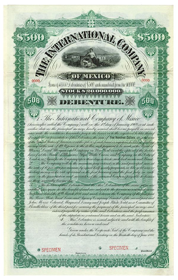 Mexico, 1888, $500, 6% Debenture, Specimen Bond, Black on green border and underprint, Woman reclined holding sickle top center with men farming wheat with town and mountain behind them and moving locomotive on left of woman, Red SPECIMEN overprints POC's and red s/n "0000", VF-XF condition, ABNC.
