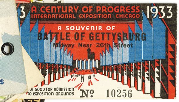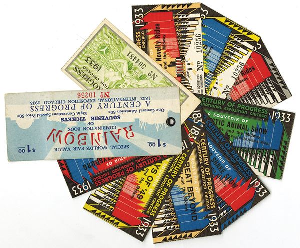 Chicago, Illinois, 1933. Rainbow Combination Book of Souvenir Tickets for the 1933 International Exposition of Chicago "A Century of Progress" with 8 special tickets: A Century of Progress; Battle of Gettysburg; Days of '49; The Great Beyond; Monster Snake Show; Domestic Animal Show; Africans; Pair of Maynes -Ilion's Novelty Rides. All 8 are souvenir tickets for a special World's Fair value, good for admission to the exposition grounds. A Century of Progress International Exposition, also known as the Chicago World's Fair, was a World's Fair held in the city of Chicago, Illinois, United States from 1933 to 1934. The fair, celebrated the city's centennial. The theme of the fair was technological innovation, and its motto was "Science Finds, Industry Applies, Man Adapts", giving out a message that science and American life were wedded. Its architectural symbol was the Sky Ride, a transporter bridge perpendicular to the shore on which one could ride from one side of the fair to the other. One description of the fair noted that the world, "then still mired in the malaise of the Great Depression, could glimpse a happier not-too-distant future, all driven by innovation in science and technology." Fair visitors saw the latest wonders in rail travel, automobiles, architecture and cigarette-smoking robots. The exposition "emphasized technology and progress, a utopia, or perfect world, founded on democracy and manufacturing."