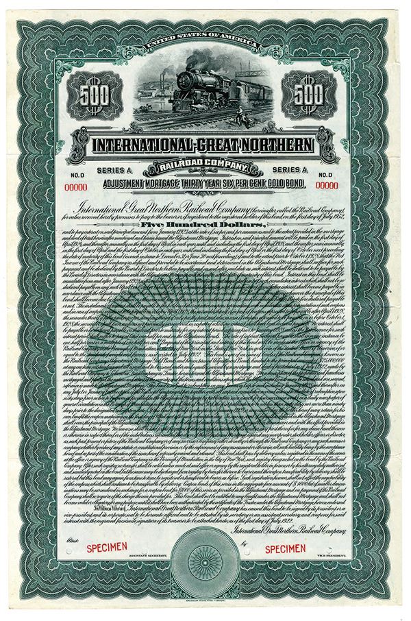 Missouri. $500 Specimen 6% Adjustment Mortgage Gold Coupon Bond, Black print on green border and under tint, Locomotive at top passing factory and workers, Specimen overprints and POC's, VF-XF condition, ABNC.