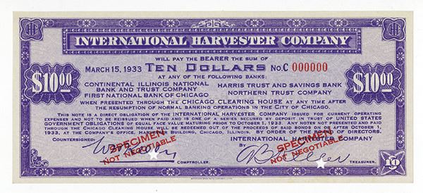 Chicago, Illinois, $10, P-Unlisted, Specimen scrip note, Purple on light purple underprint, back purple, Specimen overprints, POC's, S/N C000000, payable at numerous banks and the Chicago Clearing House, ABNC. Rare Depression scrip.
