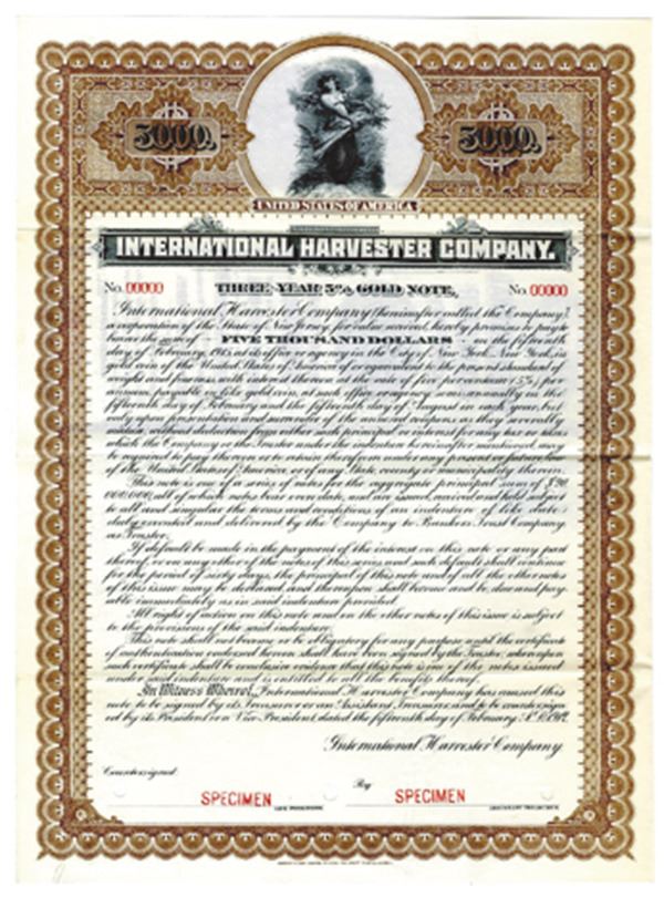 Illinois. $5,000 Specimen 5% Gold Coupon Bond, Black print on brown border and under tint, Allegorical woman with wheat at top, Specimen overprints and POC's, VF-XF condition, ABNC.
