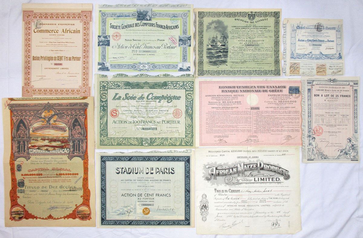 France, Greece, Portugal & Africa, 1889 to 1920s. Lot of 10 Issued Stock Certificates and Bonds representing international commerce, transportation, industry, and public works. Includes Société Générale des Comptoirs Franco-Africains; Compagnie Française du Commerce Africain; Companhia de Navegação Carregadores Açoreanos; Canal Interocéanique de Panama; Banque Nationale de Grèce; La Soie de Compiègne; Stadium de Paris; African Maize Products Ltd.; and an Exposition Universelle de 1889 bond issue, among others. Material includes bearer shares and bonds with decorative vignettes depicting maritime trade, industrial scenes, and allegorical figures. Conditions range from Good to VF overall, with expected folds, edge wear, light staining, cancellations, and handling typical of period financial documents. (10). Sold “AS IS” no returns accepted.