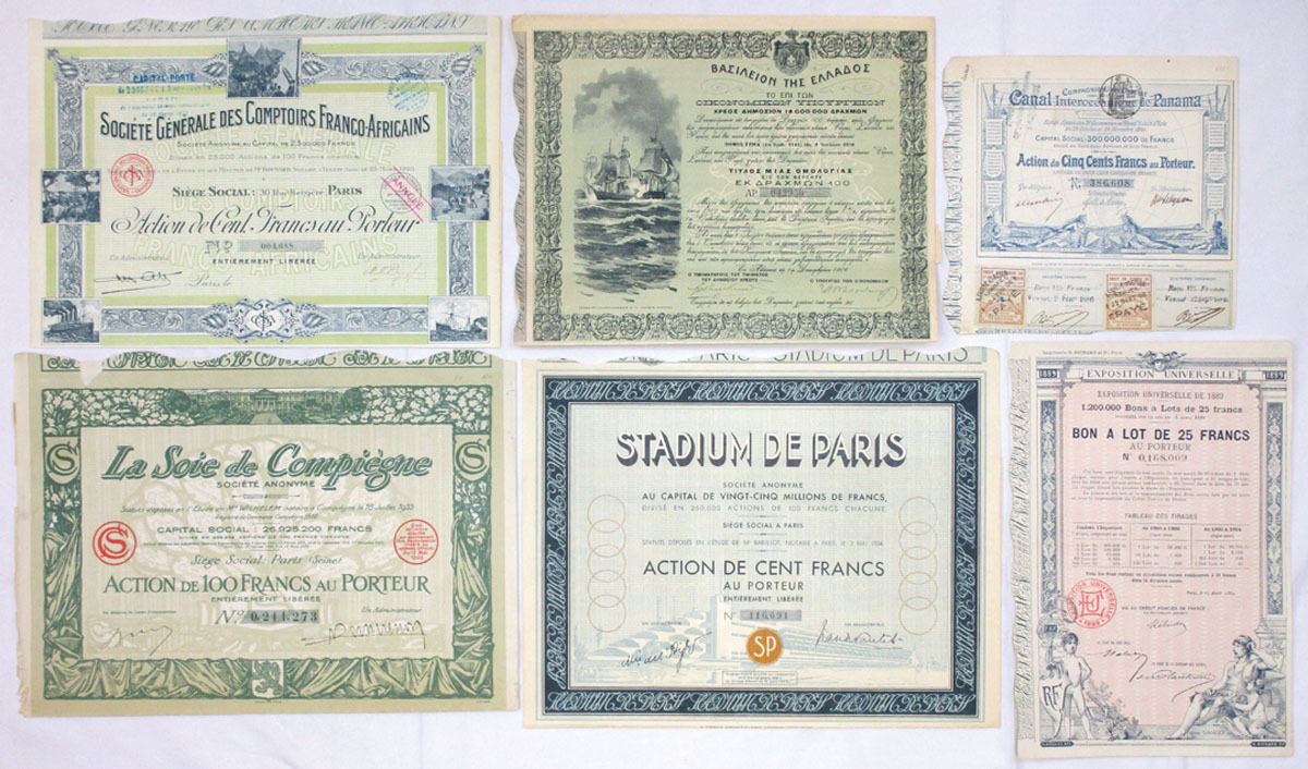 France, Greece, Portugal & Africa, 1889 to 1920s. Lot of 10 Issued Stock Certificates and Bonds representing international commerce, transportation, industry, and public works. Includes Société Générale des Comptoirs Franco-Africains; Compagnie Française du Commerce Africain; Companhia de Navegação Carregadores Açoreanos; Canal Interocéanique de Panama; Banque Nationale de Grèce; La Soie de Compiègne; Stadium de Paris; African Maize Products Ltd.; and an Exposition Universelle de 1889 bond issue, among others. Material includes bearer shares and bonds with decorative vignettes depicting maritime trade, industrial scenes, and allegorical figures. Conditions range from Good to VF overall, with expected folds, edge wear, light staining, cancellations, and handling typical of period financial documents. (10). Sold “AS IS” no returns accepted.