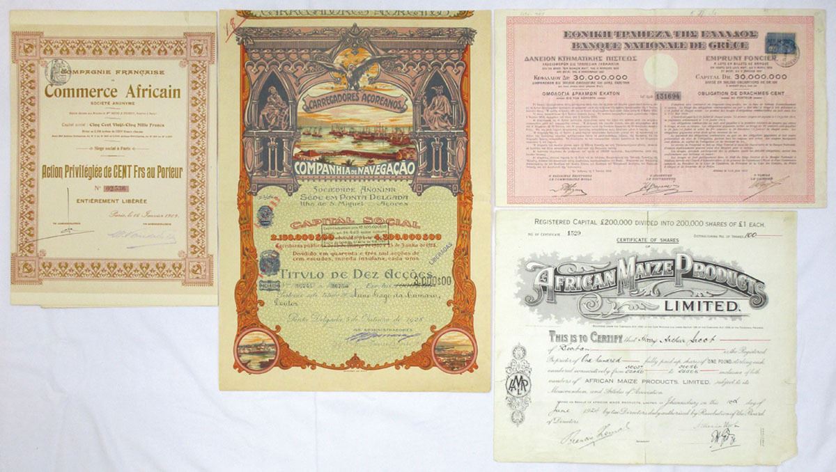 France, Greece, Portugal & Africa, 1889 to 1920s. Lot of 10 Issued Stock Certificates and Bonds representing international commerce, transportation, industry, and public works. Includes Société Générale des Comptoirs Franco-Africains; Compagnie Française du Commerce Africain; Companhia de Navegação Carregadores Açoreanos; Canal Interocéanique de Panama; Banque Nationale de Grèce; La Soie de Compiègne; Stadium de Paris; African Maize Products Ltd.; and an Exposition Universelle de 1889 bond issue, among others. Material includes bearer shares and bonds with decorative vignettes depicting maritime trade, industrial scenes, and allegorical figures. Conditions range from Good to VF overall, with expected folds, edge wear, light staining, cancellations, and handling typical of period financial documents. (10). Sold “AS IS” no returns accepted.