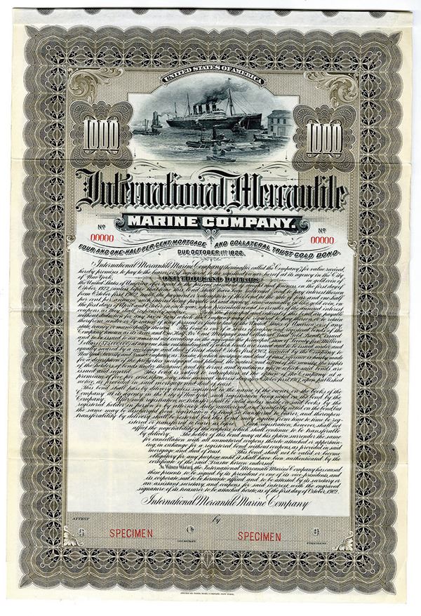 New Jersey. $1000 4 1/2% Mortgage and Collateral Trust Gold Coupon Bond, Black print on brown border and under tint, Large ship docked at top, Specimen overprints and POC's, VF-XF condition, ABNC. J.P. Morgan & Co. announced the details of the trust's organization on October 1, 1902. Named the International Mercantile Marine Company, a reorganization and renaming of the International Navigation Company. The capital stock was increased from $15 million to $60 million preferred and $60 million common stock. It was holding company under which "subsidiary lines will be permitted full liberty in managing their own affairs". Winthrop L. Marvin wrote in 1902, "the greatest shipping enterprise which the world has ever known in the work of American capital." Rare Bond with only 2 found in the ABN archives.
