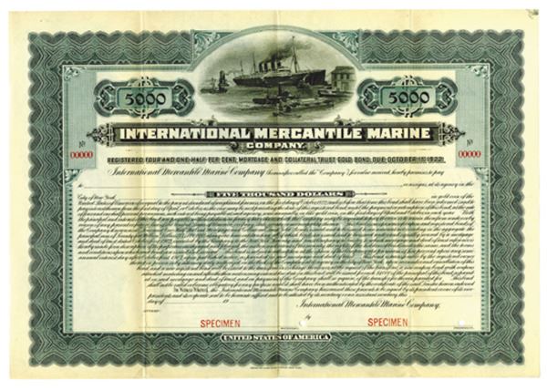 New York. $5000 Specimen 4 1/2% Registered Mortgage and Collateral Gold Bond, Black print on steel gray border and under tint in horizontal format, View of bay with ships out on water at top, Specimen overprints and POC's, Fine-VF condition, ABNC.