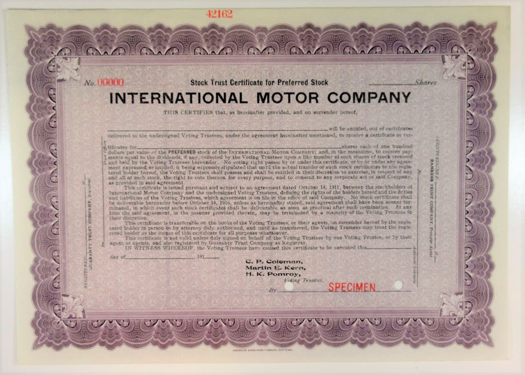 Odd Shares Specimen Preferred Stock Trust Certificate, Black text with purple border and background. Red specimen overprints, 00000 serial number, POCs. Fine-VF condition, ABNC. International Motor Company was a predecessor of the United States Motor Company (USMC). Rare specimen Stock Certificate.