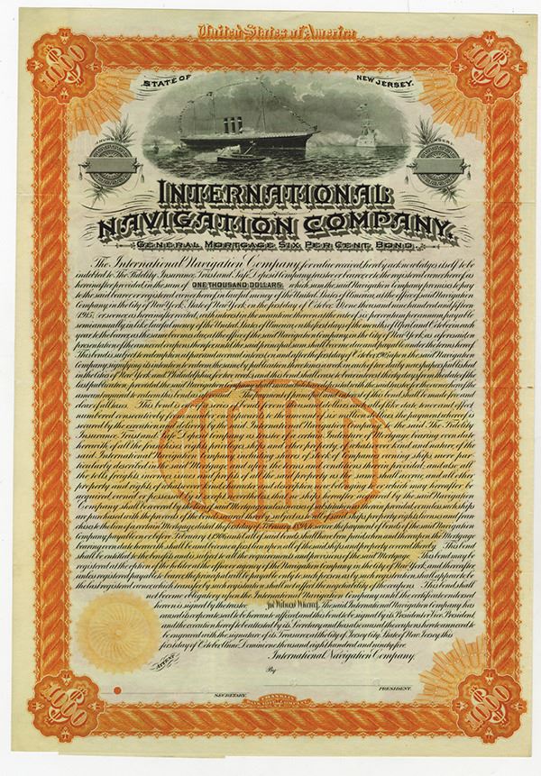 New Jersey. $1,000 Specimen 6% General Mortgage Coupon Bond, Black print on brown border and under tint, Image of large Cruise Liner at top, POC's at bottom, VF-XF condition, FBNC. INC was formed in 1871 with the backing of the Pennsylvania Railroad to operate foreign flagged vessels on transatlantic routes to Philadelphia. J.P. Morgan & Co. announced the details of the trust's organization on October 1, 1902. Named the International Mercantile Marine Company, a reorganization and renaming of the International Navigation Company.