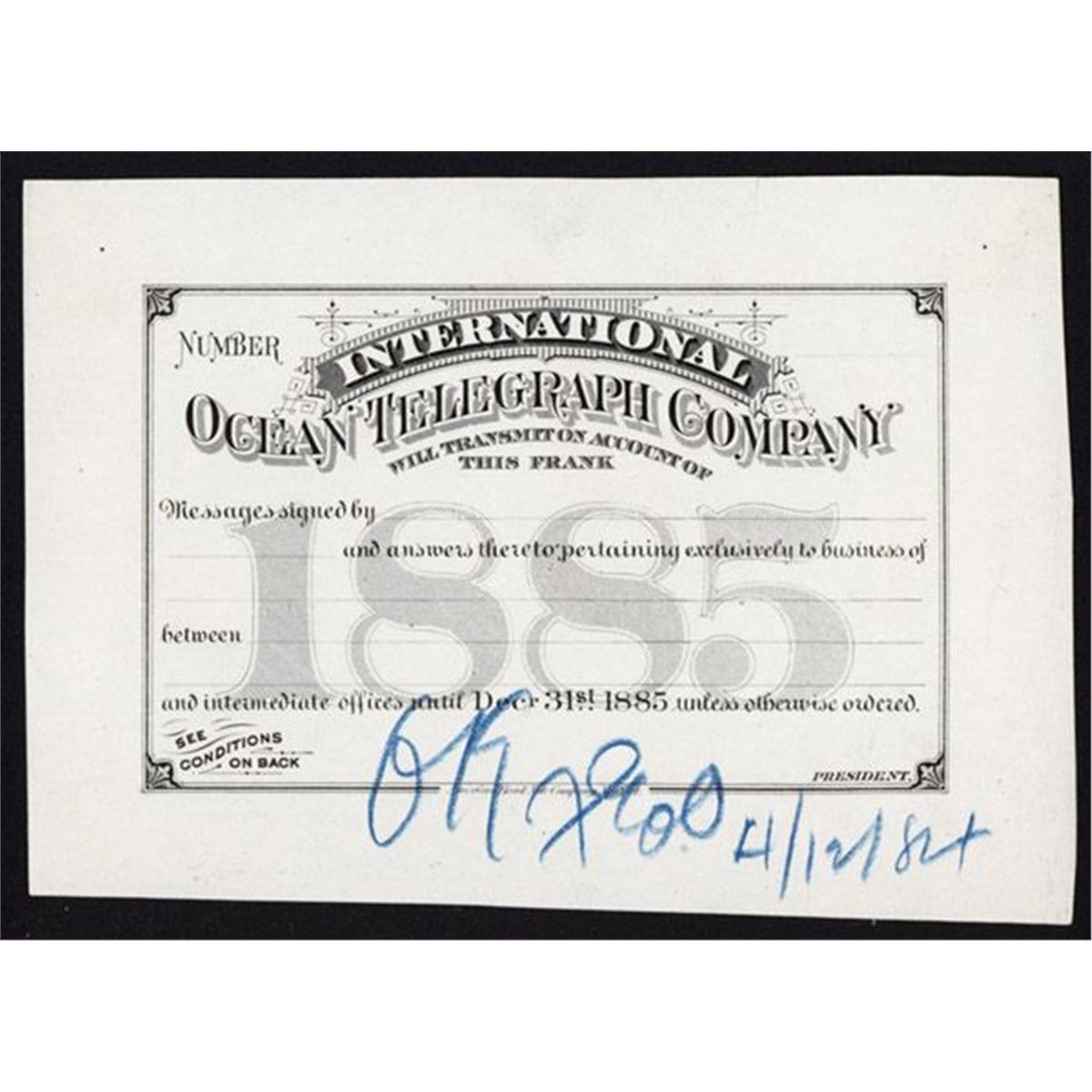 1885, Proof printed in black on india paper, dated and approved 1884, Rare and early telegraph company, ABNC.