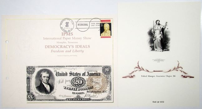 Memphis, Tennessee...... Lot of 2 pieces: International Paper Money Show, 1991 Souvenir Card featuring a $20 Treasury Note, series 1890, which features the portrait of John Marshall, at bottom, as well as a blind embossed figure of "Freedom" at left. Light brown text and gold embossed border, U.S. Supreme Court Bicentennial Stamp at top right corner. Memphis Coin Club stamp in navy at top center, more text on back. Fine-VF condition with a fold down center; Lot also includes a Souvenir Card featuring an allegorical justice at center from the Bureau of Engraving & Printing Treasury Department, with Federal Managers Association Chapter 216 at center, states it is 546 out of 800, VF condition. (2)