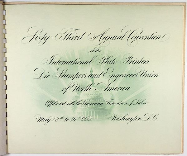 Washington, D.C., 1965, 8x10". International Plate Printers, Die Stampers and Engravers Union of North America 1893-1955 Washington, DC; Convention Booklet - printed by the BEP with vignettes and portraits.