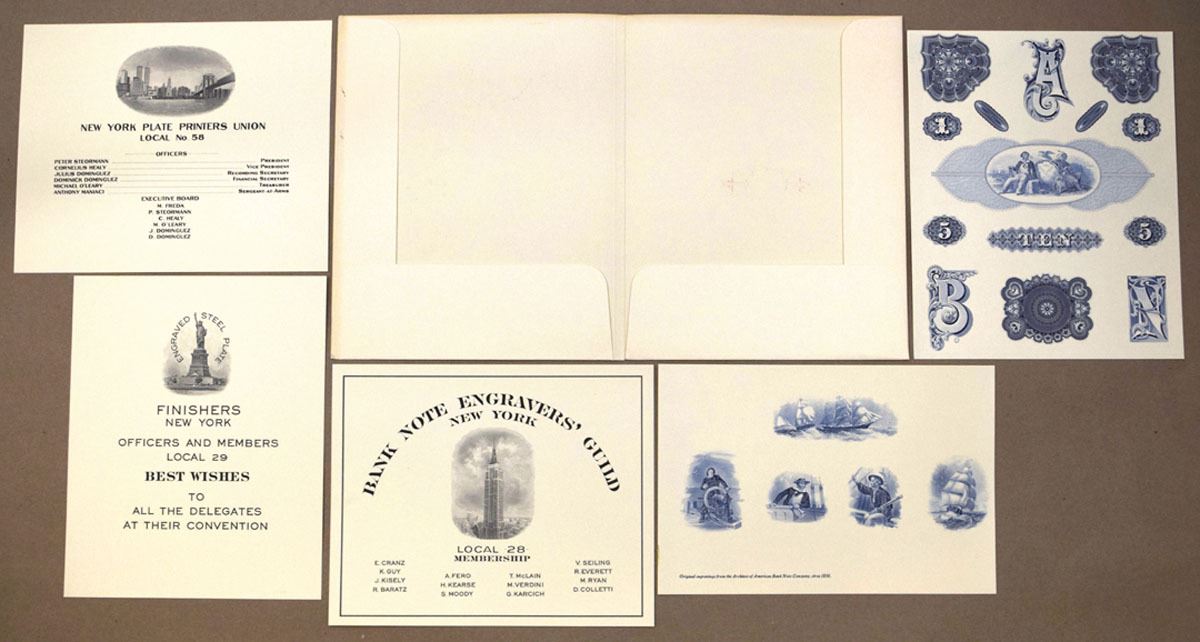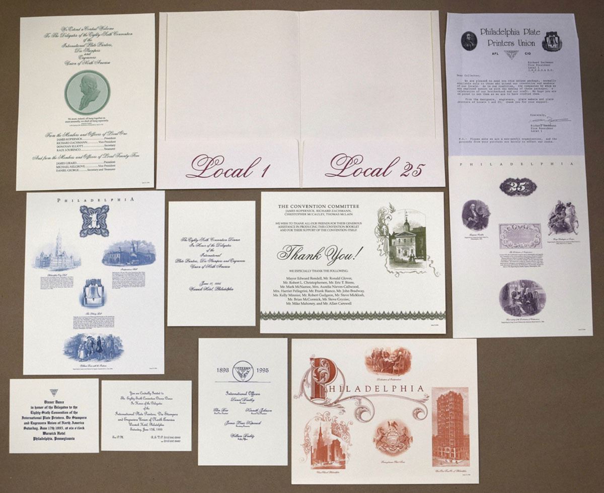 Various States. Lot of 25+ items, including convention souvenir programs, banquet invitations, and fraternal greetings issued by various locals and affiliated organizations. Highlights include programs from the Eleventh Biennial International Convention, 1983; Thirteenth Biennial Convention, Philadelphia, May 1987; and Eighty-Sixth Convention, Warwick Hotel, Philadelphia, June 11–17, 1995. Also featured is the Eighty-Seventh Convention, Fort Worth, Texas, April 20–26, 1997, with engraved and printed sheets celebrating Texan heritage and U.S. veterans. Additional items include printed greetings from the New York Plate Printers Union Local 58, Bank Note Engravers’ Guild of New York Local 28, Finishers of New York Local 29, and other locals, as well as pieces issued with compliments of the United States Banknote Company and Security-Columbian Banknote Company. Several sheets feature original-style engraved vignettes and design elements, including allegorical figures, patriotic themes, and reproductions of ABNC archive material. A large and varied grouping spanning the late 20th century, with strong ties to both the history of the engraving trade and American labor unions. Condition averages VF to Choice VF, with clean impressions and light handling. (25+). Sold "AS IS" no returns accepted.